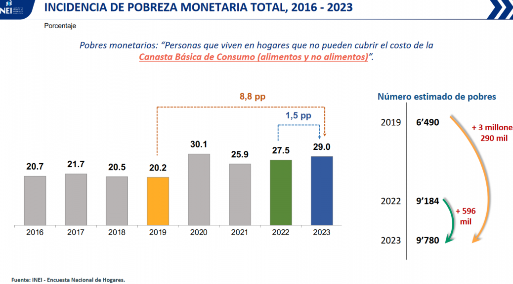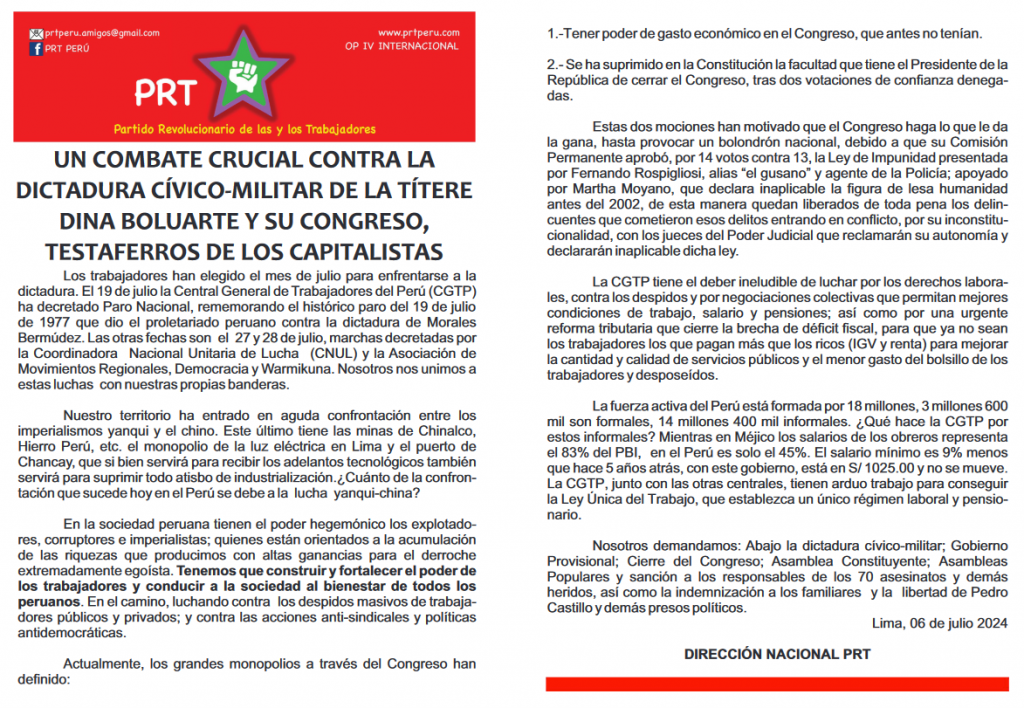 Actualmente, en Perú domina la gran burguesía, el poder es de los grandes empresarios (representados por el diario “El Comercio”), quienes avalados por el monopolio de las armas que ejercen las Fuerzas Armadas, ha desplazado a la burguesía nacional (representado por Velasco Alvarado y actualmente por el diario “La República”) . Estas dos facciones luchan por el poder, poniendo al país en una crisis sin salida. Estamos en una recesión con inflación, no salimos de la pobreza, más bien ésta ha aumentado al 30% es decir 11 millones de peruanos están al hambre. Esto es contando la pobreza monetaria, no se cuenta la pobreza física que es la falta de electricidad, de agua, etc. La educación, la salud, los servicios son un desastre, la inseguridad ciudadana se incrementa, se deja de cobrar impuestos a las grandes empresas y el presupuesto de la República disminuye. Pronto se recurrirá a los grandes empréstitos. Mientras tanto para hacer caja se recurre a las privatizaciones y a las empresas público privadas (APP).